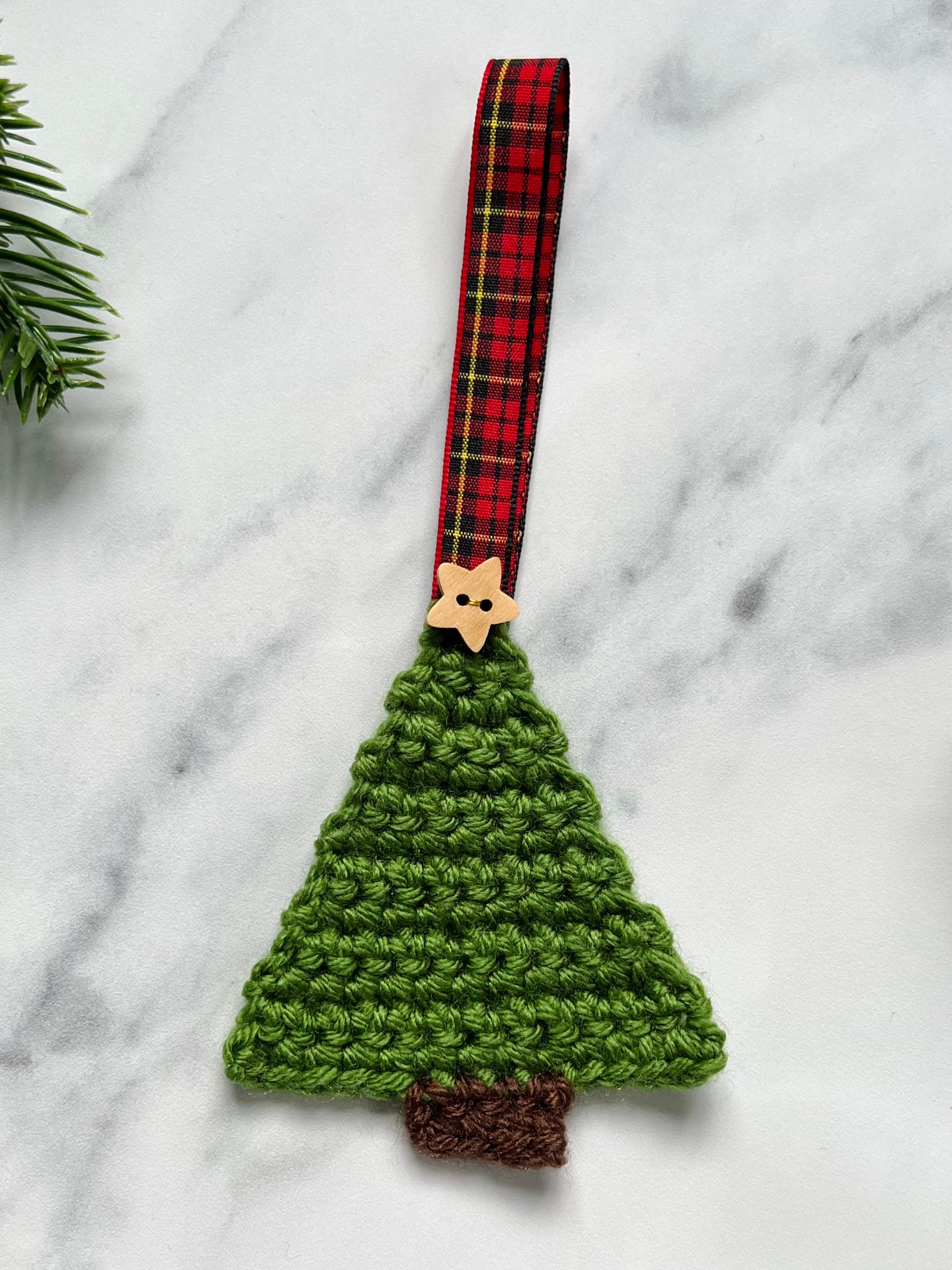 Add a sprinkle of festive cheer with this handmade crochet Christmas tree decoration! Featuring a red tartan hanging ribbon and wooden star, it’s perfect for dressing up your tree or gifting to a loved one or a special teacher. This cute little Christmas tree is sure to bring smiles and joy to your Christmas celebration.