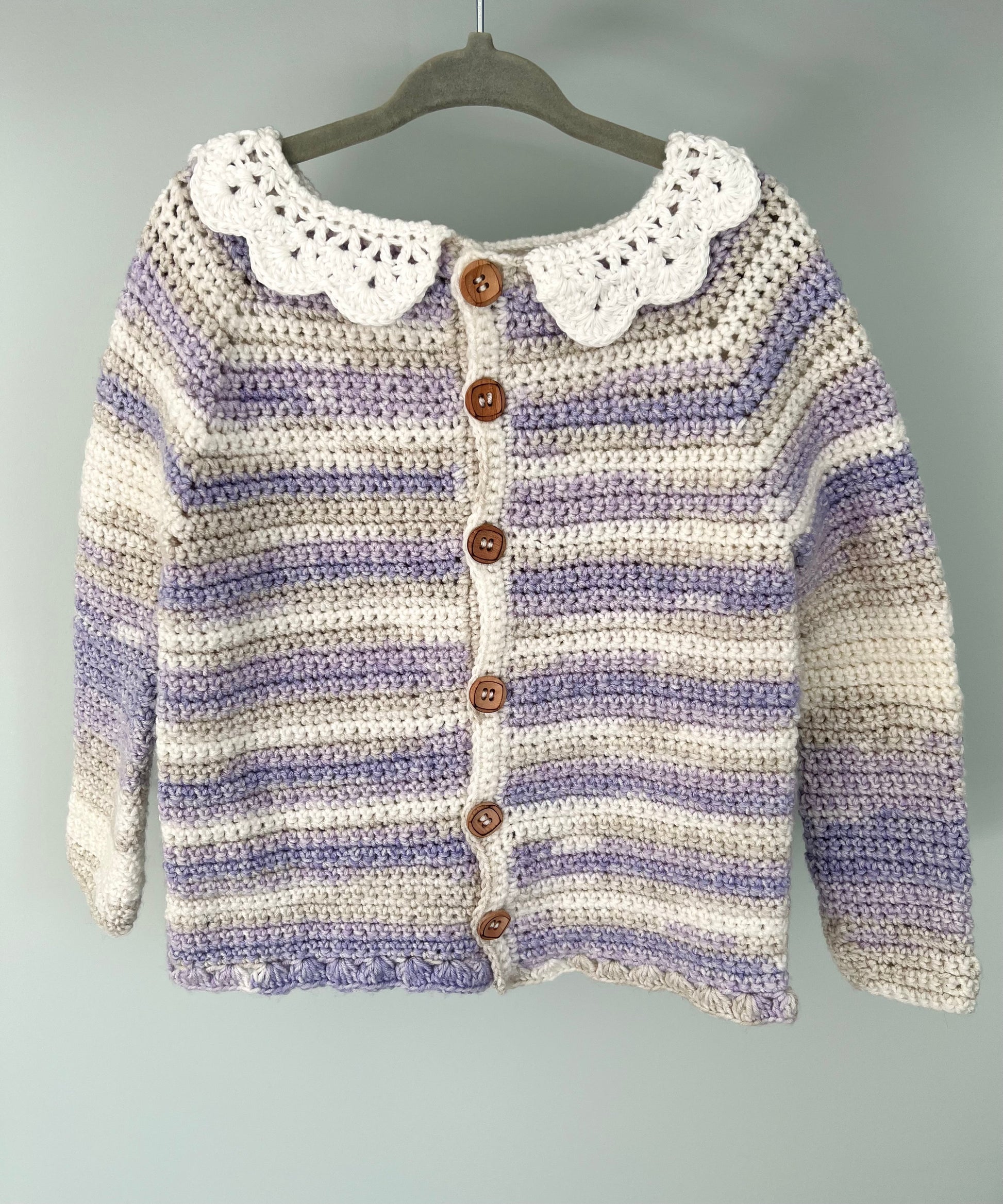 Handknit Girls Striped Cardigan – Purple, Grey & White with Crochet Collar, Floral Appliqué & Embroidery
