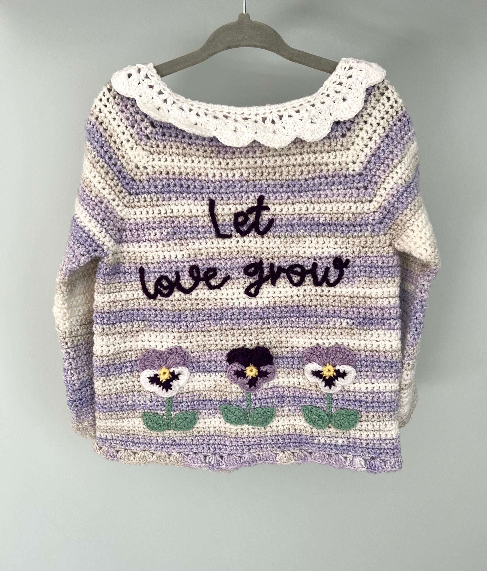 Wrap up your little one with our hand-knit girls cardigan featuring soft purple, grey, and white stripes. Designed with a delicate crochet collar, pansy flower appliqués, and hand-embroidered wording that reads "Let Love Grow". Perfect for special occasions or everyday wear.